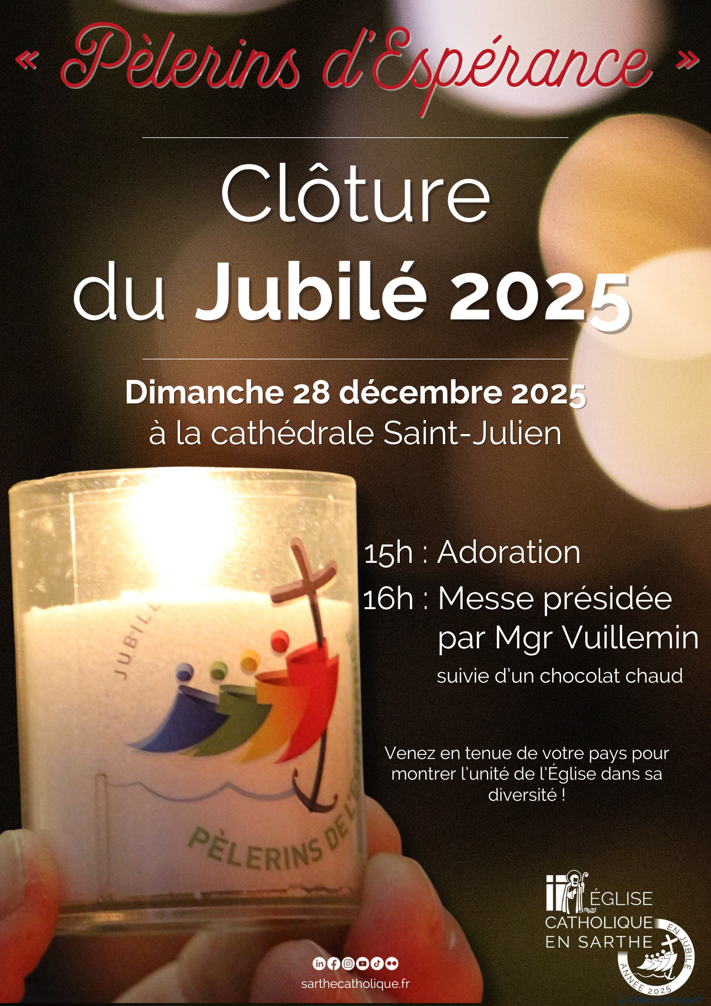 Le rendez-vous est donné à la cathédrale Saint-Julien du Mans, à 15h pour un temps d’adoration, suivi de la messe à 16h, présidée par notre évêque. Cette célébration diocésaine nous offrira l’occasion de rendre grâce ensemble pour la belle année jubilaire que nous venons de vivre. Mgr Vuillemin propose à tous les fidèles de venir vêtus des tenues traditionnelles de leur pays d’origine, afin d’illustrer la diversité des cultures, l’unité de l’Église et l’universalité de l’espérance chrétienne.