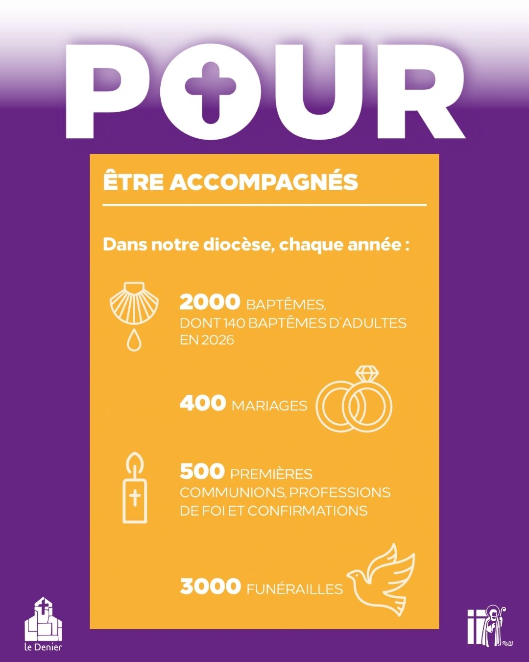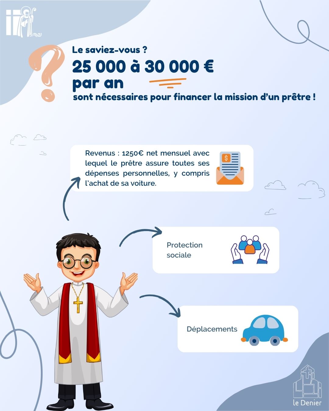 📌 Le saviez vous ? Les dons au denier permettent de verser un salaire aux prêtres et aux salariés de l’Église. D’autres ressourcent permettent le fonctionnement de nos églises et d’assurer les dépenses quotidiennement nécessaires à l’Église catholique pour accomplir sa mission.