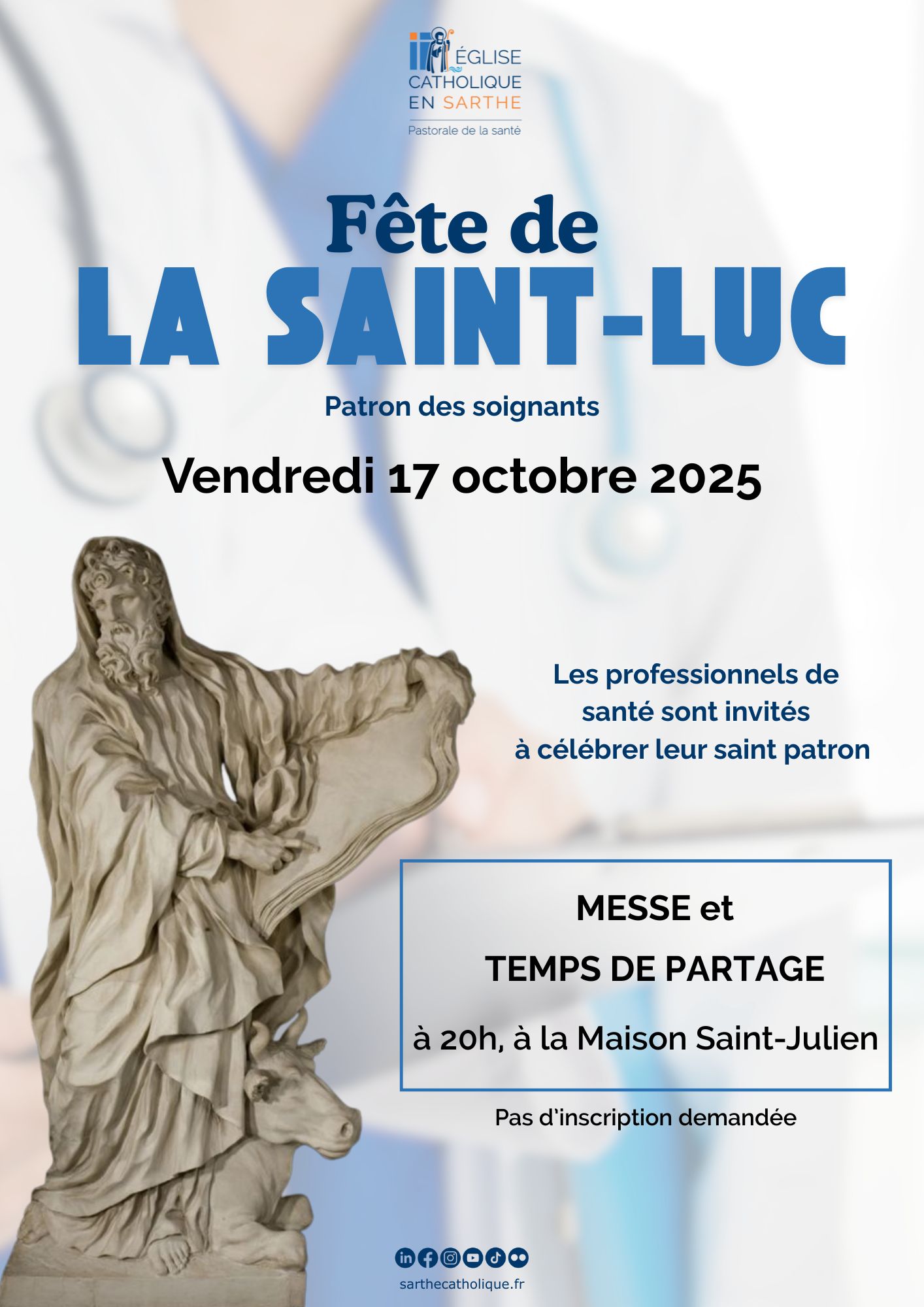 À l’occasion de la saint Luc (le 18 octobre), patron des soignants, les professionnels de santé en établissements (médecins, infirmiers, aides-soignants, directeurs d’établissements de santé/Ehpad…) ou en libéral… et acteurs de la pastorale santé, sont invités à participer à la messe anticipée de la Saint-Luc, suivie d’un temps d’échange. Cet événement unique est l’opportunité idéale de se retrouver, d’échanger et de réfléchir ensemble autour de notre mission commune.