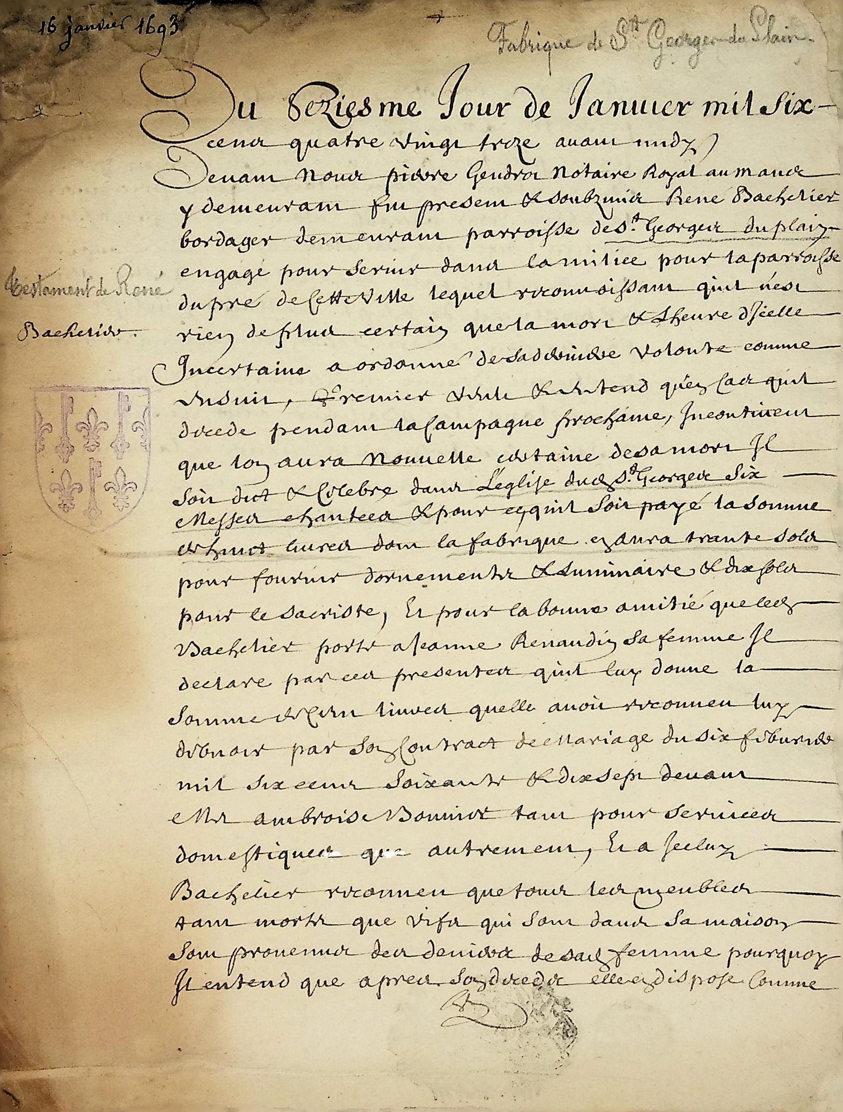 P.1 – Testament de René Bachelier, paroissien de Saint-Georges-du-Plain, 16 janvier 1693 © 1PP296 Fonds Paroisse Saint-Georges-du-Plain – ADM