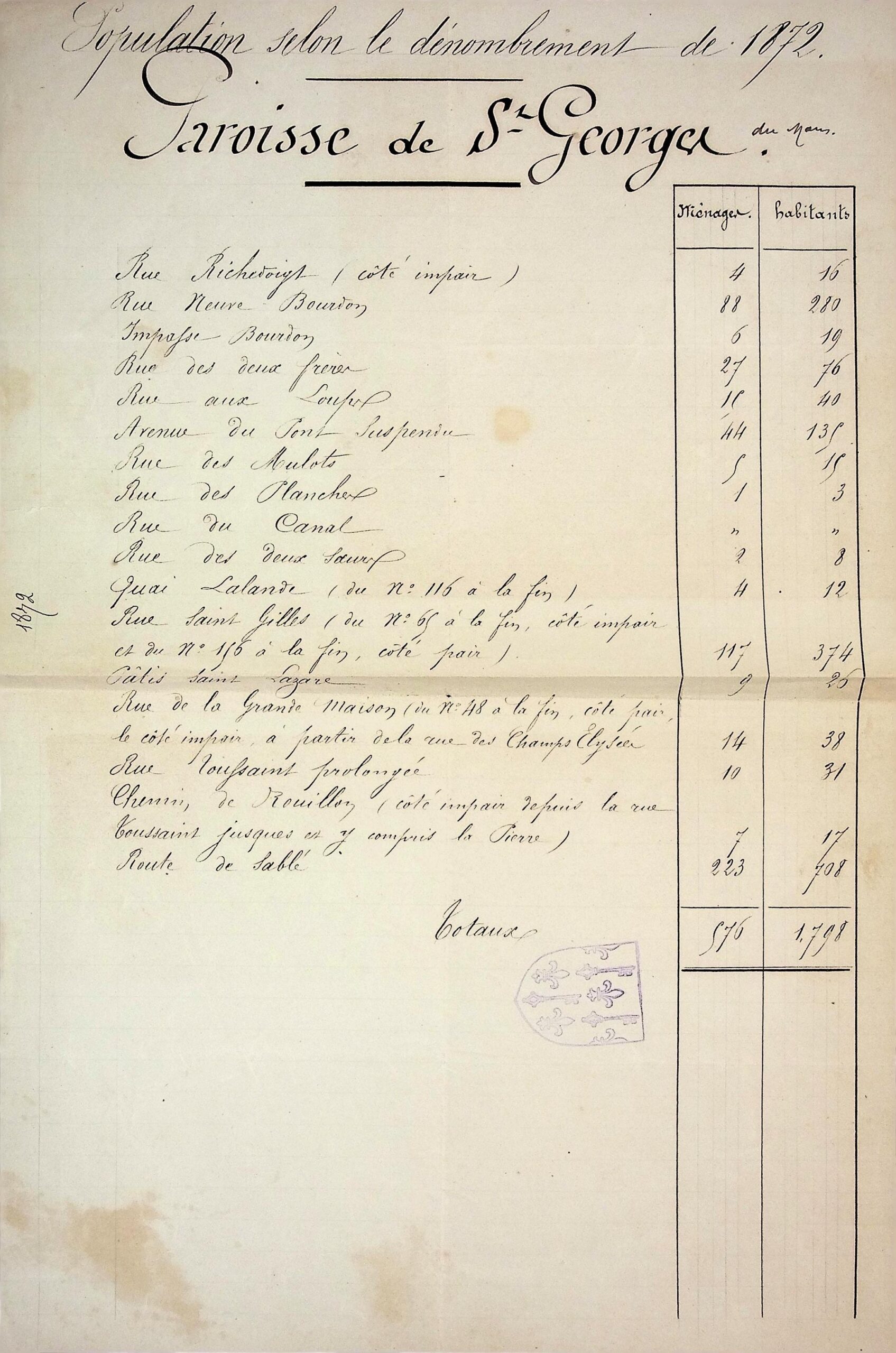 Nombre d’habitants par rues de la paroisse Saint-Georges, 1872 © 4P09 Fonds Paroisse Saint-Georges-du-Plain – ADM