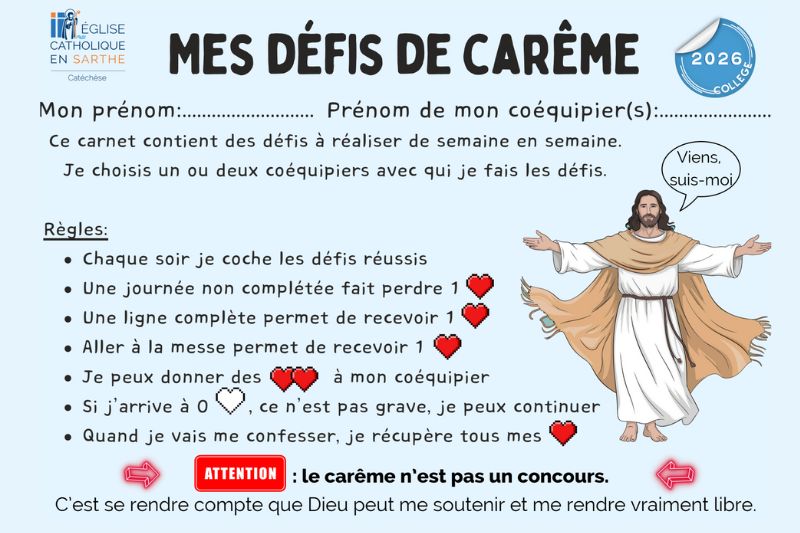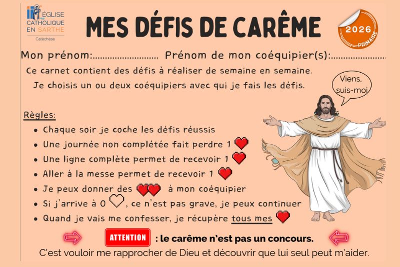 Ces livrets proposent des défis concrets, ludiques et ajustés à réaliser chaque jour axés sur le jeûne, la prière ou le partage. Les défis changent chaque semaine et leur difficulté augmente à l’approche de Pâques !