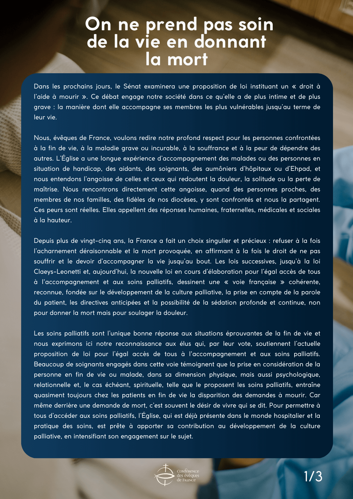 L’Église catholique en France, par la voix de ses évêques, ses associations de solidarité, et ses aumôniers agissant auprès des personnes malades, n’a eu de cesse d’alerter sur la menace qui pèse sur les plus fragile et sur le mise en question du respect dû à toute vie humaine.