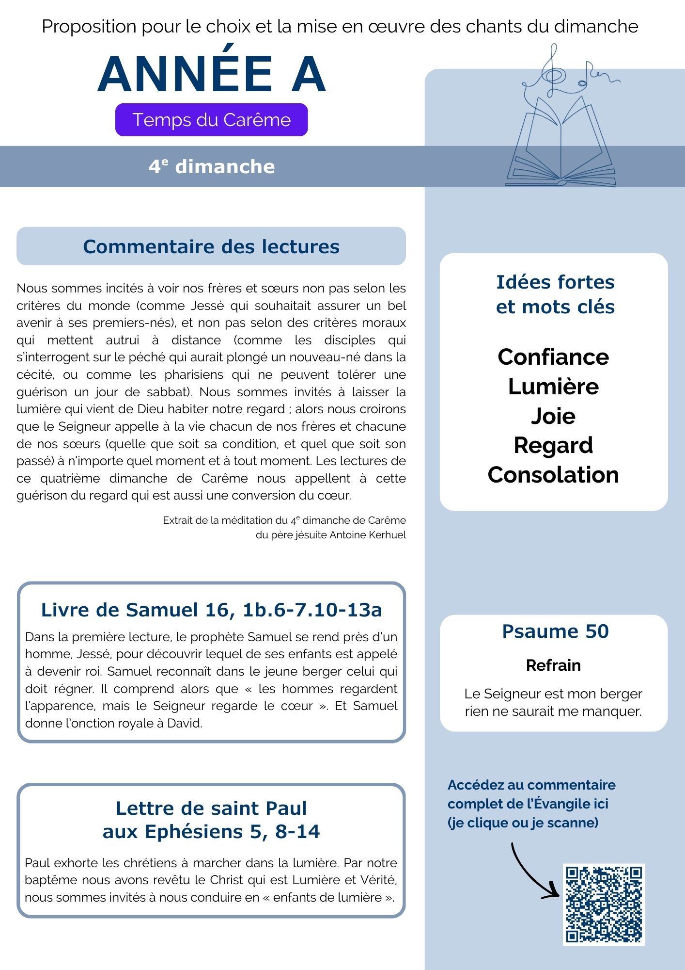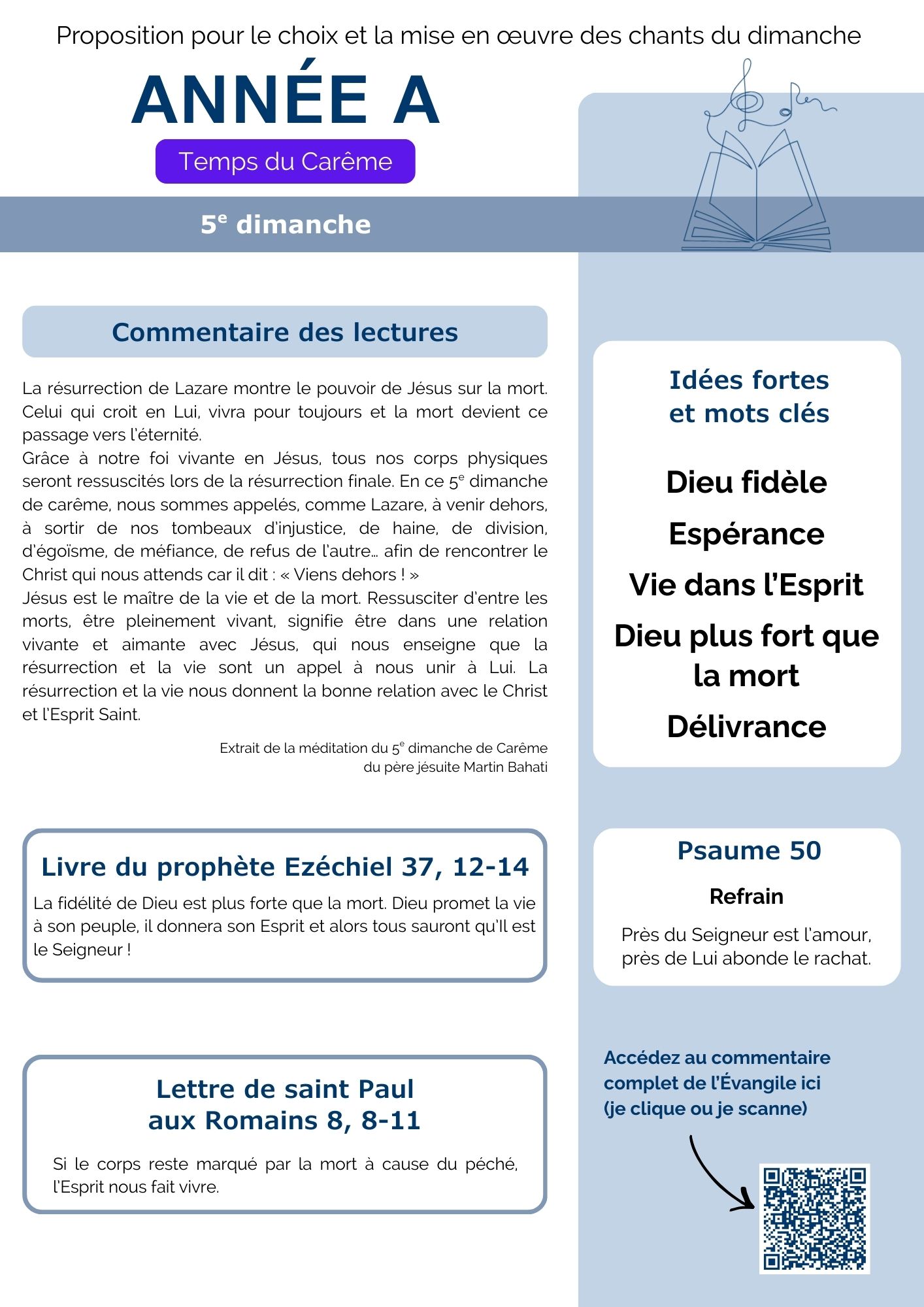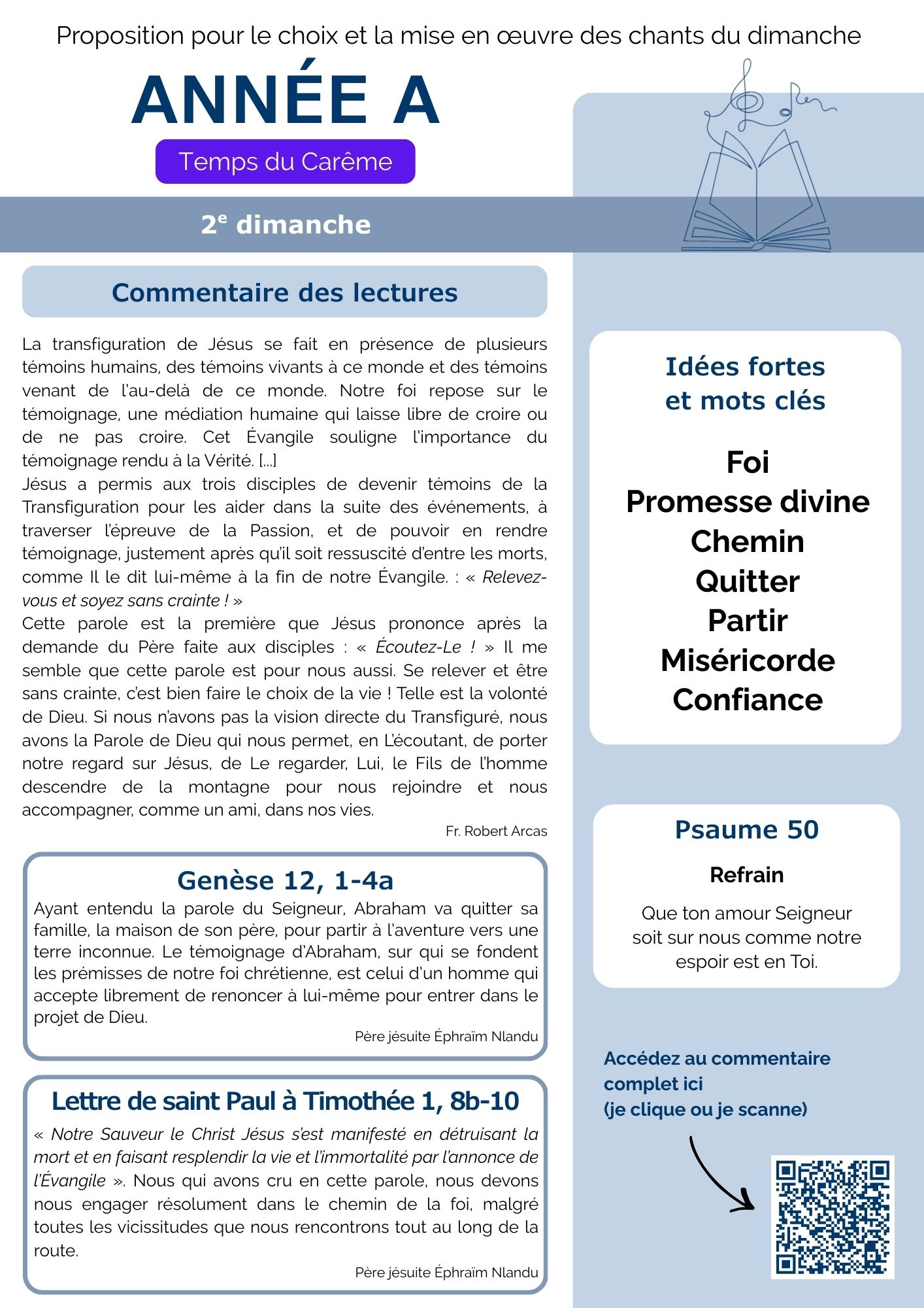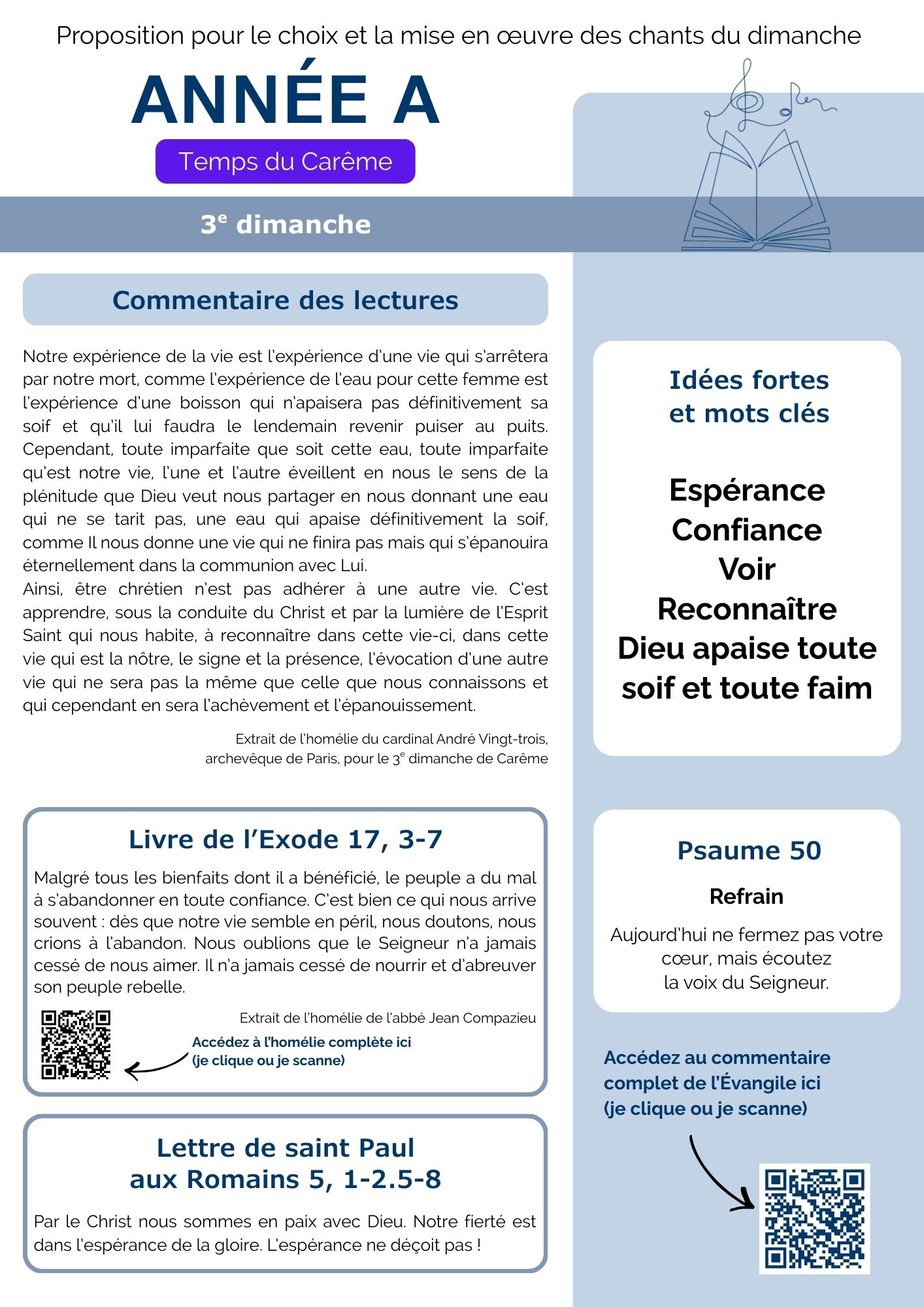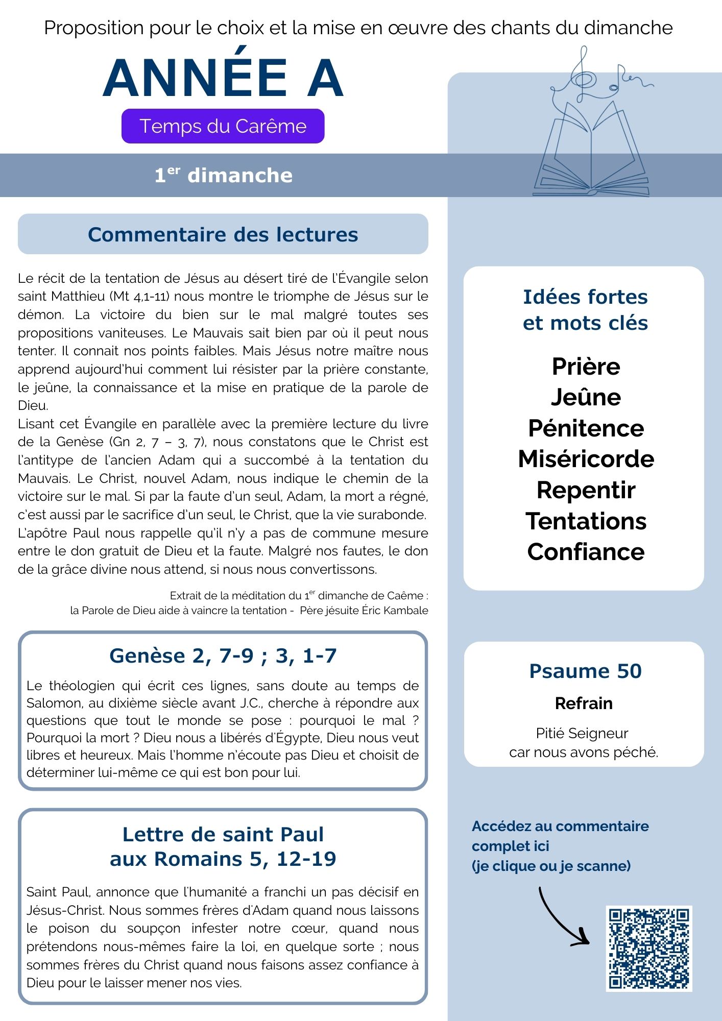 Chaque semaine, la commission Musique liturgique propose une fiche pour vous aider dans le choix et la mise en œuvre des chants pour les messes dominicales. Vous y trouverez des méditations et explications sur les lectures du jour, des mots clés, des propositions de chants et des conseils sur la façon de les chanter pour respecter l’esprit de la liturgie. Dans un premier temps découvrez nos suggestions pour les dimanches du Carême.