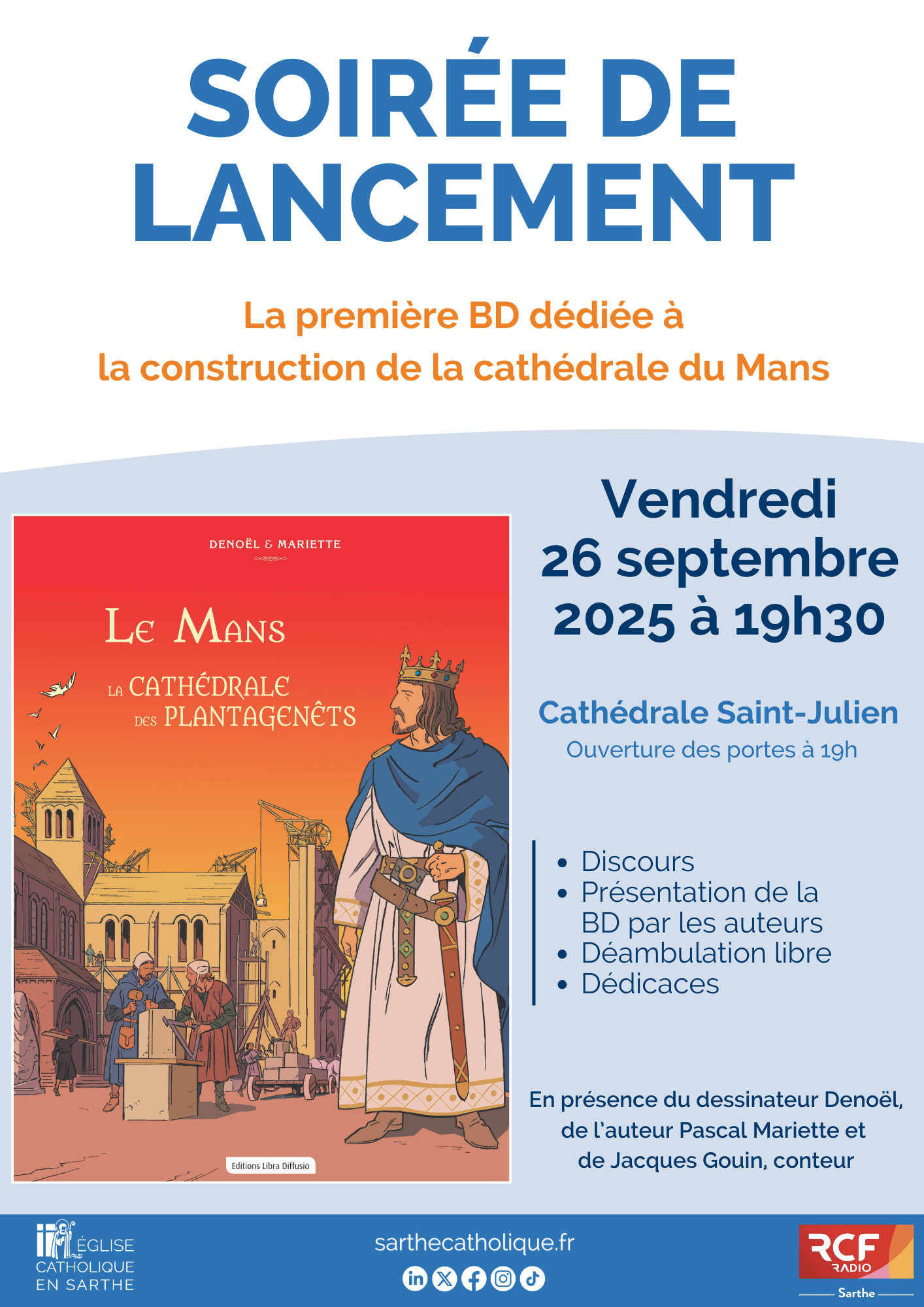 Associé à ce projet, le diocèse du Mans organise une soirée de lancement le vendredi 26 septembre 2025. Elle sera introduite par un discours à 19h30, suivi d’une table ronde qui permettra aux auteurs de présenter la bande dessinée. Les visiteurs pourront ensuite découvrir l’édifice librement dans l’ambiance particulière de la soirée et assister à une séance de dédicaces. Le dessinateur Denoël, l’auteur Pascal Mariette et le conteur Jacques Gouin y seront présents.
